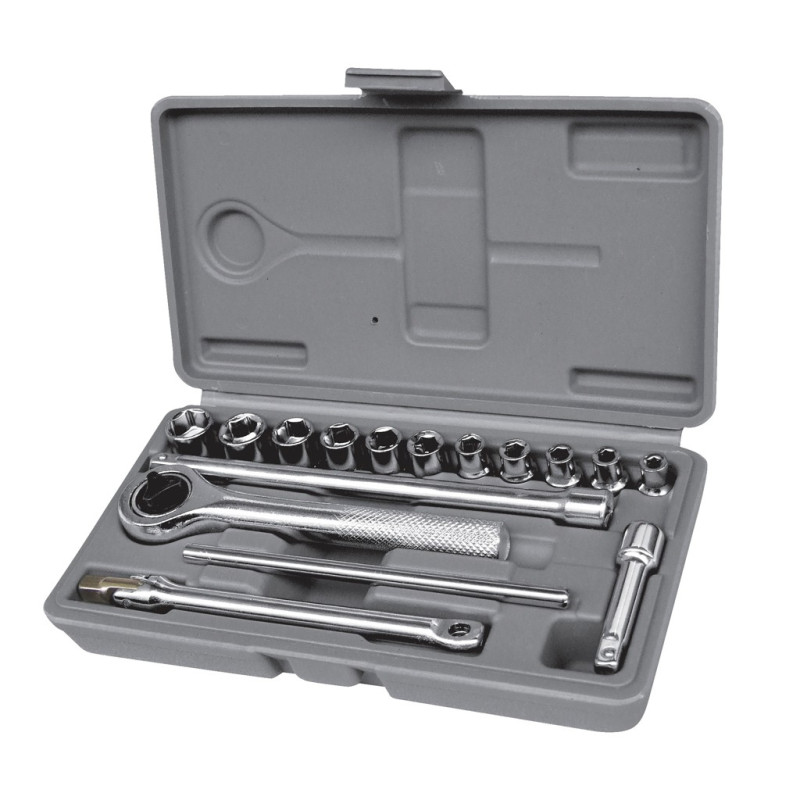 1шт 1/4" трещотка реверсная11шт 1/4" головки: 4, 4.5, 5, 6, 7, 8, 9, 10, 11, 12, 13 мм1шт 1/4" удлинитель 6"1шт 1/4" удлинитель 2"1шт 1/4" крутящийся диск1шт 1/4" крутящаяся рукоятка 6"