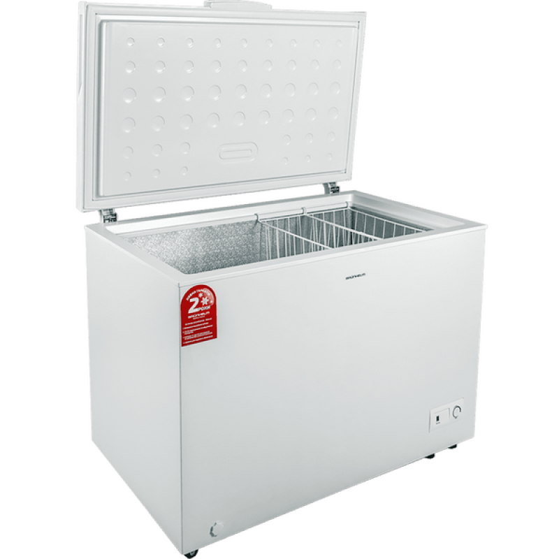 Морозильный ларь Grunhelm GCFW-300 Морозильный ларь Grunhelm GCFW-300 - однокамерный с двумя корзинами со статическим размораживанием и механическим управлением. Объем 290 л, мощность замораживания 18 кг/сутки. Легкое передвижение на встроенных колесиках. Имеет встроенные ручки с трех сторон крышки. Быстрая и удобная разморозка нижним клапаном. Бесшовная внутренняя камера. Возможность работы в режиме холодильника.