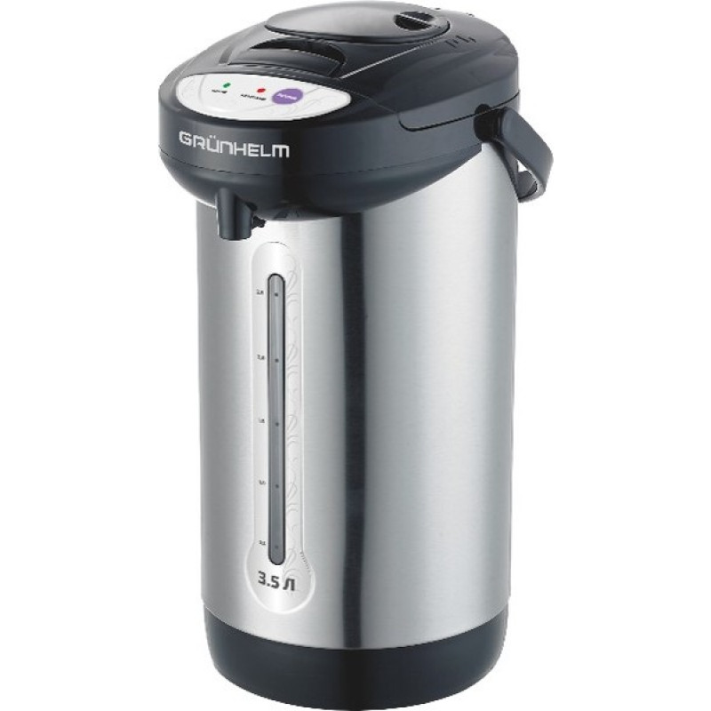 Термопот GTP352S Grunhelm Термопот GTP352S Grunhelm обладает большой емкостью 3.5 л, что дает возможность использовать его во время вечеринок, мероприятий или пикников. С помощью термопота можна подогреть остывшую воду с функцией "повторное закипание". Горячая вода подается с помощью встроенного насоса, достаточно просто поставить чашку и нажать кнопку.