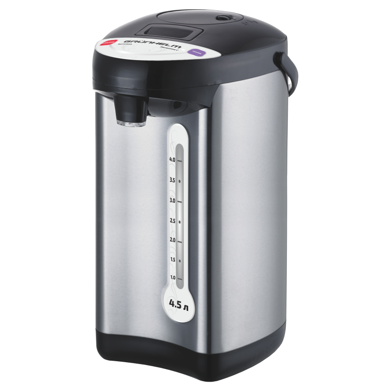 Термопот GTP452S Grunhelm Термопот GTP452S Grunhelm обладает большой емкостью 4,5 л, что дает возможность использовать его во время вечеринок, мероприятий или пикников. С помощью термопота можна подогреть остывшую воду с функцией "повторное кипячение". Горячая вода подается с помощью встроенного насоса, достаточно просто поставить чашку и нажать кнопку. Температуру нагрева воды можно регулировать, есть режим поддержания температуры.