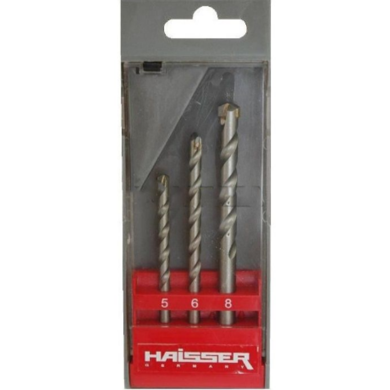 Набор сверл по бетону 3 шт. Haisser Набор сверл по бетону 3 шт. Haisser - качественный набор для электроинструмента включает в себя 3 сверла (5x85 мм; 6x100 мм; 8x110 мм), которые предназначены для работы по бетону, камню, кирпича и т.д. Качественный материал - инструментальная сталь, делает его износостойким и долговечным.