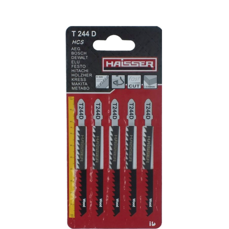 HAISSER Т244D Набор пильных полотен 5шт Набор пильных полотен 5шт HAISSER Т244D - является расходным материалом для электро - лобзика, состоит из 5 пильных полотен наиболее востребованных типов, которые позволяют выполнять тонкие прямые распилы по мягкой древесине, пластике или ДСП толщиной от 3 до 30 мм. Шлифованное, разведенное полотно изготовлено из высокоуглеродистой стали - HCS.