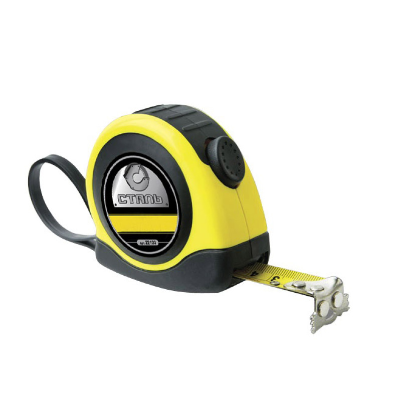 Сталь 22922 Рулетка измерительная AUTO стоп 5м х 19мм Измерительная рулетка в пластиковом корпусе с прорезиненными вставками для защиты от падения и уменьшения скольжения. В изделии предусмотрено автоматическое сматывание ленты при нажатии на кнопку и фиксация полотна при ее опускании. Для удобства работы в одиночку предусмотрен магнитный крючок, который позволяет удержать ленту на разных поверхностях.