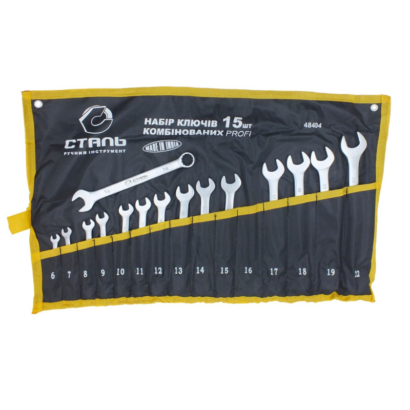 Страна-производитель товара: Индия. Покрытие жарочной поверхности: сатин. Материал головки насоса: хром-ванадиевая сталь. Тип биты: ключи комбинированные. Форма: прямые. Количество ключей в наборе: 15 шт.. Посадочные размеры: 6, 7, 8, 9, 10, 11, 12, 13, 14, 15, 16, 17, 18, 19, 22 мм.