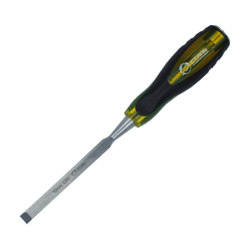 Стамеска ударная 10 мм CR-V Сталь Стамеска ударная Сталь - столярный ручной режущий инструмент, используется для выборки небольших углублений в древесине твердых и мягких пород, зачистки пазов, снятия фасок, рельефной и контурной резьбы. Изготовлена из высококачественной хромо - ванадиевой стали CR-V, усиленная и ударопрочная, что гарантирует высокий комфорт работы. Прозрачная рукоятка с прорезиненными вставками эргономичной формы обеспечивает удобный захват, исключает проскальзывание инструмента в руке. Диаметр 10 мм.