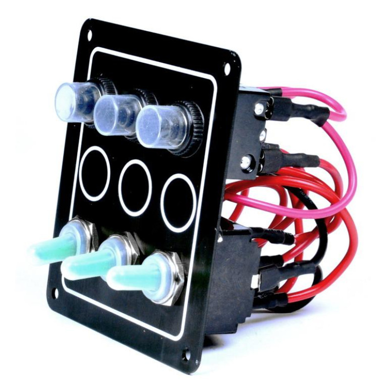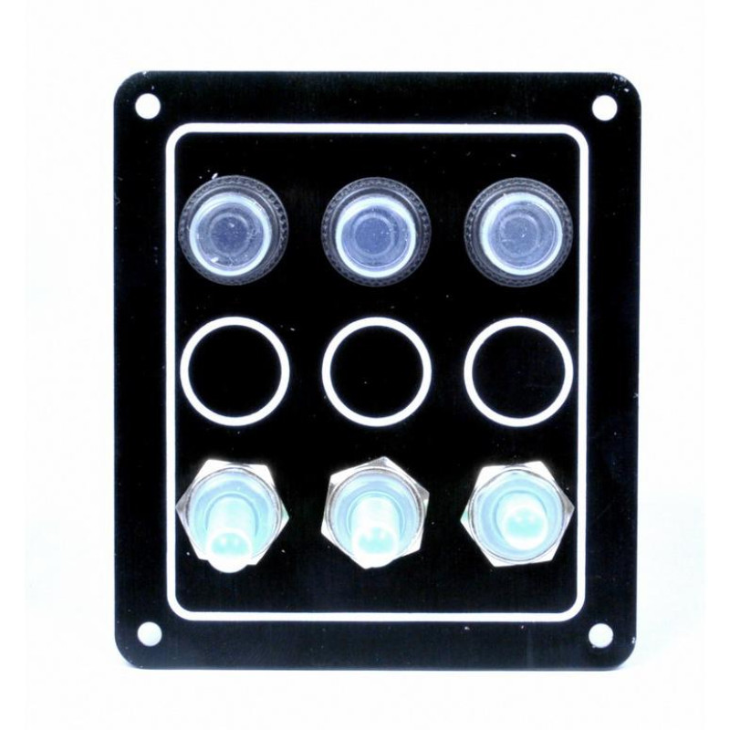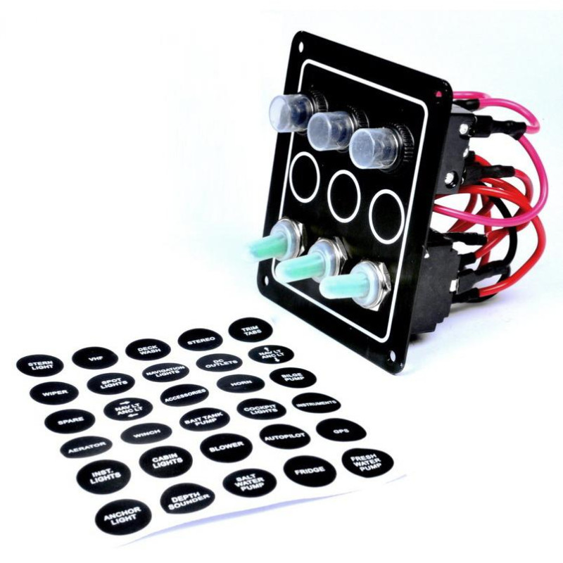 10032-BK панель на 3 переключателя , Тайвань• материал: алюминиевая пластина• 12 Вольт• автоматы 10A x 2, 15A x 1• 30 наклеек• Размер: 101.8mm x 89.1mm x 1.5mm• Влагостойкий