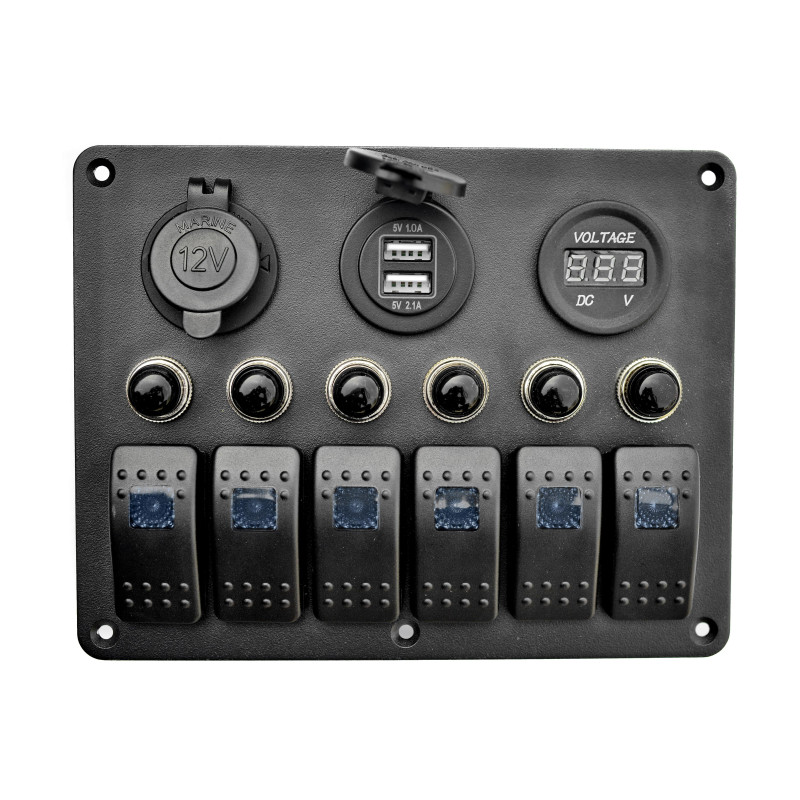 Панель на 6 переключателей автомат 155х115мм + прикуриватель, двойной USB порт, вольтметр HF60-106BU купить по оптовой цене с доставкой в магазине Ellada.com.ua