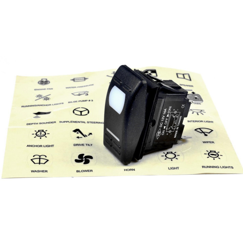 10123-01 SPST 3выхода ON — OFF Встроенный LED индикатор25 наклеек в набореМаксимально 15A (ON) — включено при удержании ON — включено постоянно