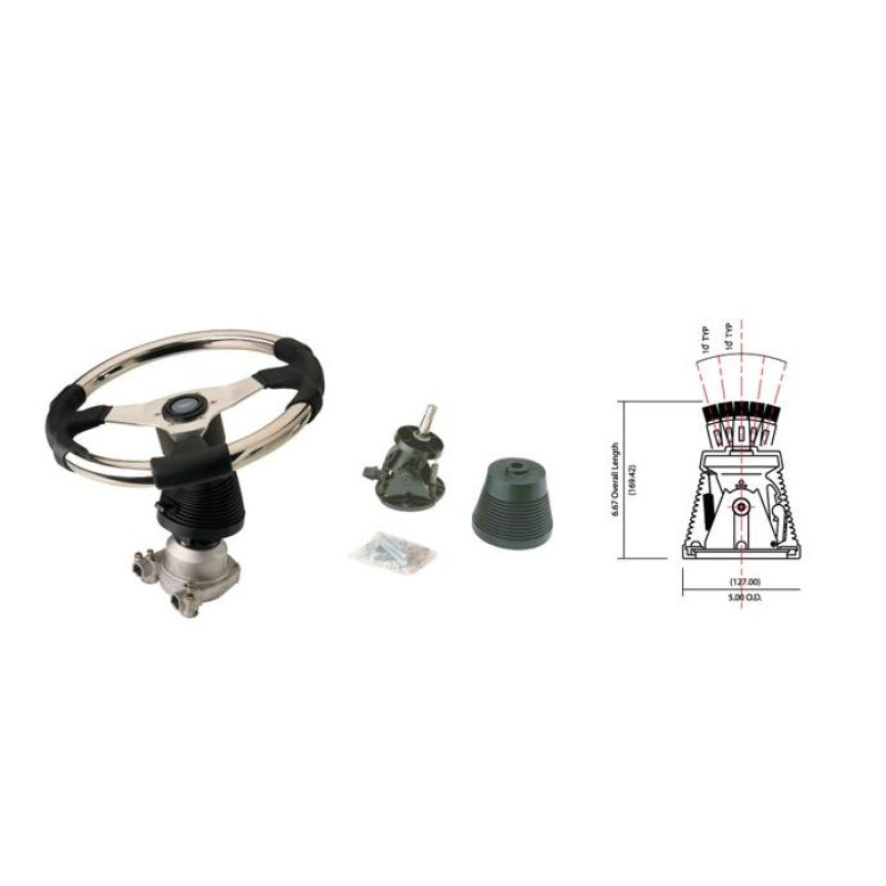 Характеристки:Тип изделия: Наклонный рулевой редукторДля моторов (л.с): до 150Максимальный диаметр рулевого колеса (мм): 406Пять положений наклона в пределах 40°Количество оборотов: 3,8Планетарный механизмСтандарт троса: М66Размер (мм): 169х127Круглый конический вал диаметром (мм): 19 (3/4?)Комплектуется монтажным комплектомМеханизм наклона укомплектован стандартным черным гофрированным чехломИнструкция по подбору длины рулевого троса