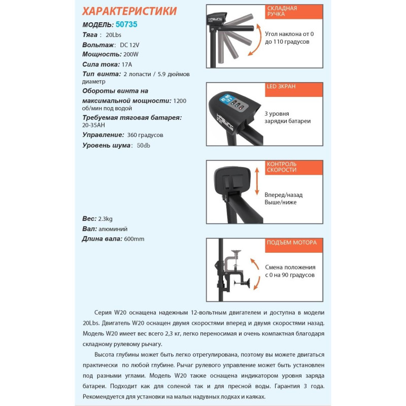 50735 Электромотор Haswing W-20Серия W20 оснащена надежным 12-вольтным двигателем и доступна в модели 20Lbs.Двигатель W20 оснащен двумя скоростями вперед и двумя скоростями назад.Модель W20 имеет вес всего 2,3 кг, легко переносимая и очень компактная благодаря складному рулевому рычагу.Высота глубины может быть легко отрегулирована, поэтому вы можете двигаться практически по любой глубине. Рычаг рулевого управление может быть установлен под разными углами. Модель W20 также оснащена индикатором уровня заряда батареи. Подходит как для соленой так и для пресной воды. Гарантия 2 года.Рекомендуется для установки на малых надувных лодках и каяках.