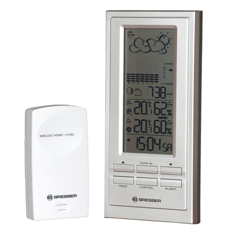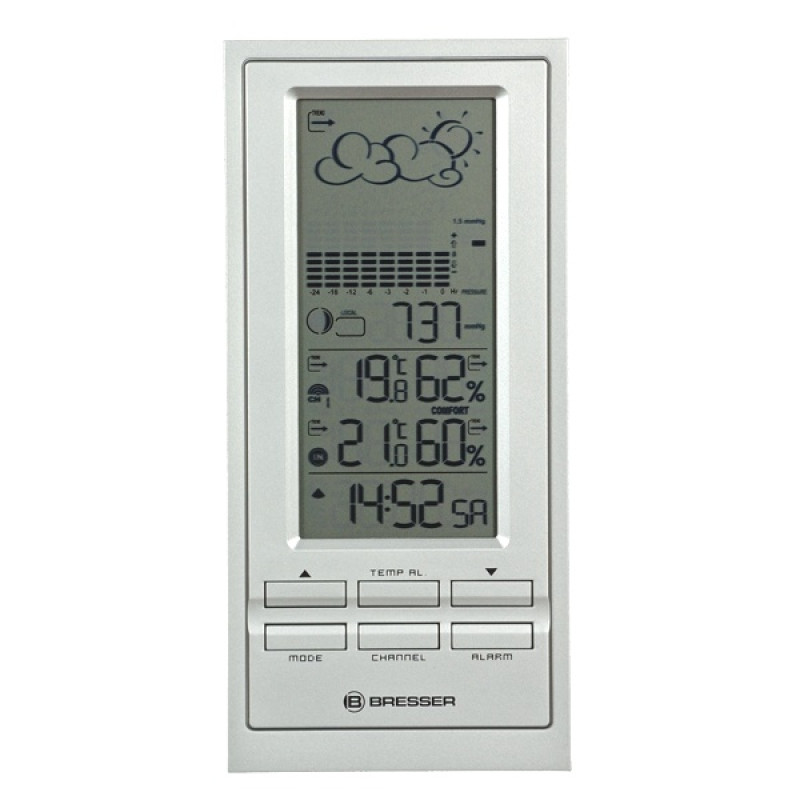 Метеостанция Bresser TemeoTrend NBF отображает не  только текущую погоду, но и прогноз на ближайшие часы. Эта погодная станция даёт представление о таких важных климатических параметрах, как температура, влажность и давление. Важно, что все эти данные метеостанция фиксирует как в помещении, так и на улице. А возможность подключения до трёх датчиков позволяет охватить довольно широкую площадь для измерения данных.