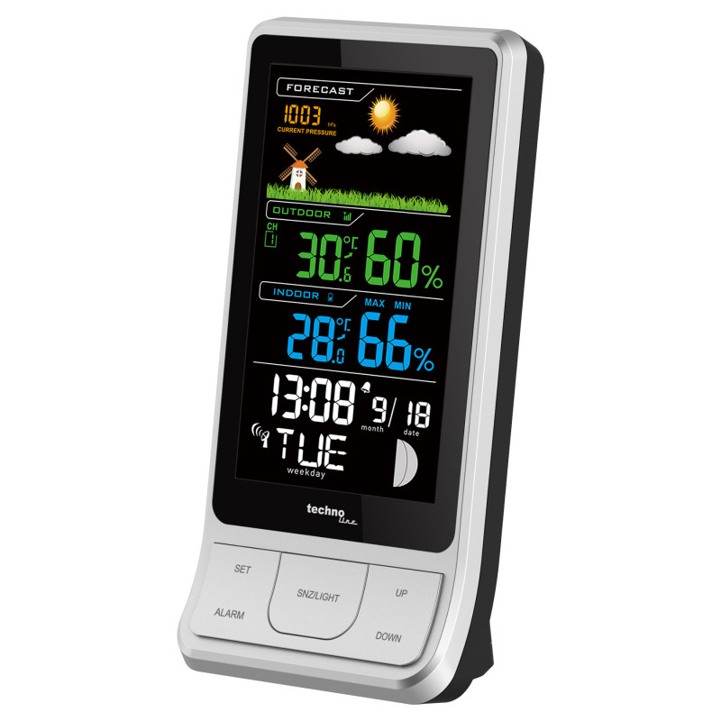 Удачный дизайн, яркий цветной дисплей, наличие всех наиболее важных функций и радиодатчика внешней температуры и влажности делают Technoline WS6441 одной из наиболее привлекательных метеостанций для домашнего использования. Эргономичная форма корпуса и большие кнопки управления, размещенные на передней панели, позволяют удобно переключаться между режимами одним пальцем руки. На ярком цветном дисплее четко отображаются все погодные символы и значения атмосферного давления, температуры и влажности. Яркость дисплея можно регулировать, либо отключить.