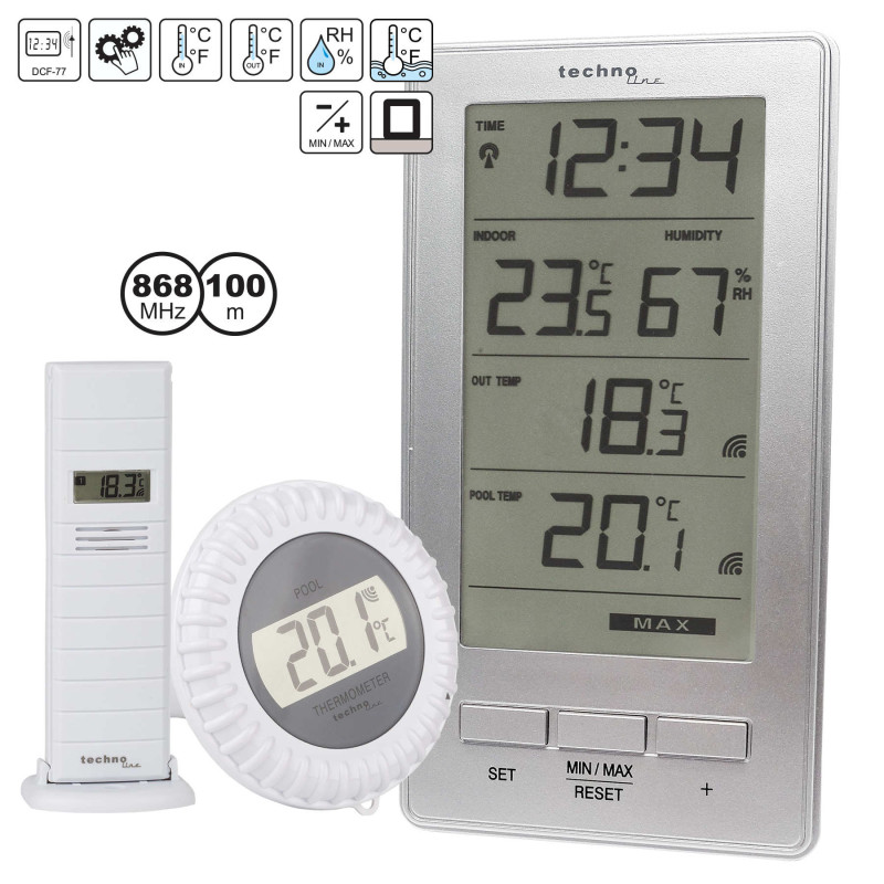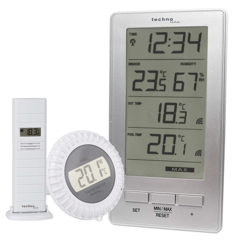 Теперь для того, чтоб знать температуру воды в бассейне не обязательно каждый раз подходить и опускать градусник в воду. Термогигрометр Technoline WS9069 имеет водонепроницаемый температурный датчик, который, находясь в бассейне, передает температуру на расстоянии до 100 метров с помощью радиосигнала на основной блок с дисплеем, установленный в доме. При этом основной блок также измеряет внутреннюю температуру, влажность, отображает точку росы, принимает показания температуры воздуха от второго внешнего выносного датчика и показывает минимальные и максимальные значения этих параметров.
