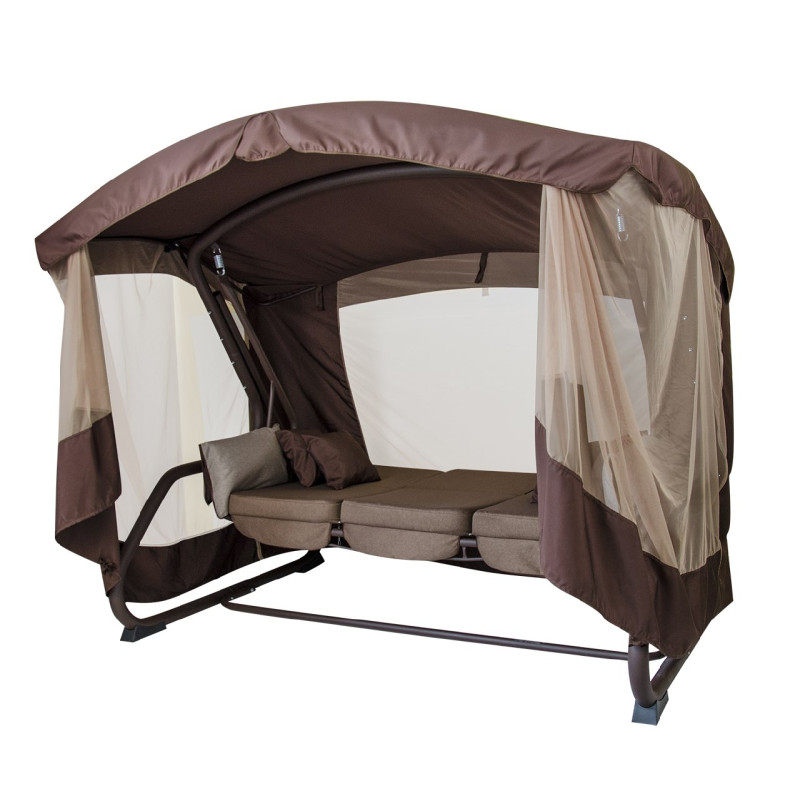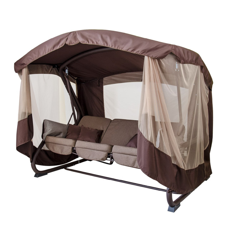 Самая большая и оригинальная модель, для большой компании и с максимальной нагрузкой. Любите отдыхать с комфортом, тогда качели с навесом и москитной сеткой «Mokko»– это отличное решение для Вашего сада. Покататься на свежем воздухе или просто полежать, любят и дети и взрослые. Надёжная конструкция рассчитана на большие нагрузки, так что сидеть на уютном диване-качели смогут пять взрослых или целая орава детей.Преимущество модели заключается в том, что Вы легко можете сделать из сидячего положения- лежачее, стоит только откинуть спинку. Качели превращаются в полноценную кровать на которой можно спать на открытом воздухе. Навес защитит от солнца в знойный день и спасет во время дождя. Москитная сетка которая закрывается со всех сторон, создает впечатление закрытой беседки. Вы можете уединиться и в летнюю пору ночевать прямо под открытым небом не боясь, что насекомые потревожат.Каркас качели «Mokko» выполнен из толстых стальных труб. Основа сиденья представляет собой пружинный блок, который сделан методом плетения металлической проволоки, что обеспечивает надежность и удобство при сидении. Наполнитель сиденья-поролон, 80 мм, защитит от соприкосновения с металлом, будете чувствовать себя комфортно и мягко. Дополнительно в комплекте идут 4 подушки, дополнительно идут мягкие накидки на подлокотники в виде подушек. При необходимости всю ткань качели «Mokko» можно снять и постирать.Благодаря лёгкости конструкции, качели можно переставлять по участку в разные места по желанию. Садовые качели становятся любимым местом полноценного отдыха и приятного времяпрепровождения на свежем воздухе.Характеристика:— материал: полиэстер с наполнителем;— цвет: коричневый;— каркас: сталь, трубы диаметром 16-60 мм;— размер в разложенном виде: 188х230х150 см (ВхДхШ);— размер в упакованном виде: 227*90*42см (ВхДхШ);— размер сиденья: 53,5/107х181 см (ГхШ);— высота спинки: от сиденья 51 см;— вес: 79.5 кг;— нагрузка: 350 кг.
