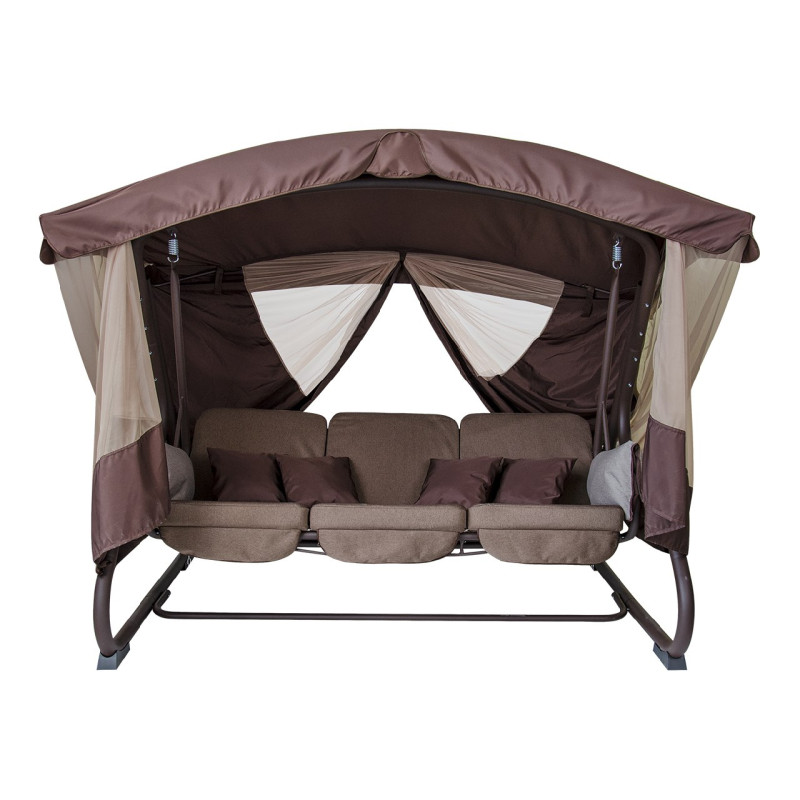 Самая большая и оригинальная модель, для большой компании и с максимальной нагрузкой. Любите отдыхать с комфортом, тогда качели с навесом и москитной сеткой «Mokko»– это отличное решение для Вашего сада. Покататься на свежем воздухе или просто полежать, любят и дети и взрослые. Надёжная конструкция рассчитана на большие нагрузки, так что сидеть на уютном диване-качели смогут пять взрослых или целая орава детей.Преимущество модели заключается в том, что Вы легко можете сделать из сидячего положения- лежачее, стоит только откинуть спинку. Качели превращаются в полноценную кровать на которой можно спать на открытом воздухе. Навес защитит от солнца в знойный день и спасет во время дождя. Москитная сетка которая закрывается со всех сторон, создает впечатление закрытой беседки. Вы можете уединиться и в летнюю пору ночевать прямо под открытым небом не боясь, что насекомые потревожат.Каркас качели «Mokko» выполнен из толстых стальных труб. Основа сиденья представляет собой пружинный блок, который сделан методом плетения металлической проволоки, что обеспечивает надежность и удобство при сидении. Наполнитель сиденья-поролон, 80 мм, защитит от соприкосновения с металлом, будете чувствовать себя комфортно и мягко. Дополнительно в комплекте идут 4 подушки, дополнительно идут мягкие накидки на подлокотники в виде подушек. При необходимости всю ткань качели «Mokko» можно снять и постирать.Благодаря лёгкости конструкции, качели можно переставлять по участку в разные места по желанию. Садовые качели становятся любимым местом полноценного отдыха и приятного времяпрепровождения на свежем воздухе.Характеристика:— материал: полиэстер с наполнителем;— цвет: коричневый;— каркас: сталь, трубы диаметром 16-60 мм;— размер в разложенном виде: 188х230х150 см (ВхДхШ);— размер в упакованном виде: 227*90*42см (ВхДхШ);— размер сиденья: 53,5/107х181 см (ГхШ);— высота спинки: от сиденья 51 см;— вес: 79.5 кг;— нагрузка: 350 кг.