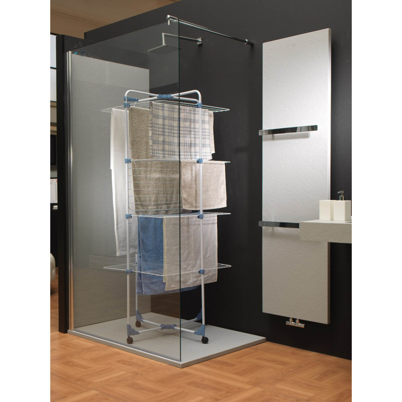 Стальные элементы конструкции имеют антикоррозийное покрытие. Опорные стойки оборудованы 4 полноповоротными колесами, благодаря которым перемещение всей конструкции по жилому помещению стало чрезвычайно легким и максимально безопасным по отношению к поверхности пола. Надежная и практичная, сделана из экологически чистых материалов, сушилка для белья Gimi Linear 3 станет надежным помощником в квартире, ведь ее легко разместить, даже, в душевой кабине.