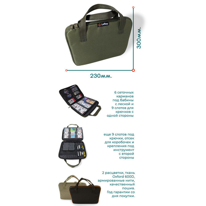 Компактная и вместительная, эта сумка-органайзер нужна тем, кто любит хранить всё необходимое для в 1 месте.Характеристики:Размер: 30 х 23 х 2 см (Лист формата А4).Износостойкая ткань Oxford 600D. 4 крепления для инструментов.18 слотов для крючков (каждый карман вмещает до 10 пачек). 6 карманов из сетки для бабин с леской любого размера.Вместительный карман для коробок и мелочей.Преимущества: Все ваши крючки и лески теперь разложены по местам. Прозрачные элементы - названия и размеры снастей У каждого инструмента есть своё место. Компактность - размер сумки как лист А4.Контроль остатка лески и крючков как дважды два, теперь вы сразу увидите, если какая-то позиция заканчивается. Слоты из прозрачного материала позволяют разместить огромный запас крючков и рассортировать их по размеру, типу или производителю. Также, можно подписать кармашки фломастером, и при необходимости стереть.Карманы для лески выполнены из сетки с крупной ячейкой, что даёт возможность увидеть производителя и толщину лески, не вынимая бобину. 6 кармашков достаточно для хранения всех популярных диаметров лески вне зависимости от метража.Снаружи, сумка имеет очень выдержанный и стильный вид. Оливковый вариант окантован зеленым кедером, черный - оранжевым. Минималистичный дизайн и компактный размер.