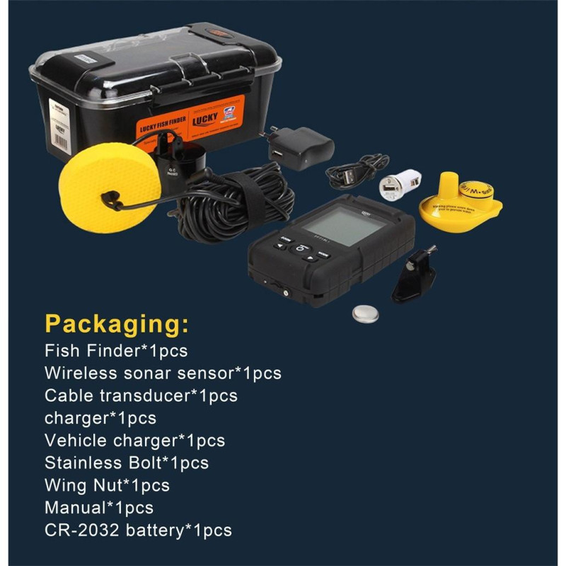 Эхолот FF718LiCТехнические характеристики эхолота Lucky ff718lic Fish Finder русское менювысококонтрастная матрица экрана;размер экрана: 48*48мм;разрешение экрана: 132*132;дальность радиосвязи беспроводного датчика: более 180м;влагонепроницаемый корпус;температурный датчик;прорисовка рельефа дна;максимальная глубина: — беспроводный датчик — 35м; — проводной датчик — 100м;угол луча проводного датчика — 45 градусовугол луча беспроводного датчика — 90 градусовоперационная частота: — проводной датчик — 200 KHz; — беспроводный датчик — 125 KHz;длина кабеля проводного датчика: около 7 метров;питание эхолота: всроенный литий-ионный аккумулятор: 3.7 В;питание беспроводного датчика: 1 батарея CR2032;автоматическое отключение беспроводного датчика вне воды;регулировки: — уровень чувствительности; — единицы измерения: Цельсий, метр;диапазон глубины;отображение рыбы 3 размеров (большая, маленькая, средняя);сигнал разряда батареи;настраиваемая яркость экрана;сигнал мелководья. Комплектация эхолота Lucky ff718licЭхолот Lucky ff718licДатчик с кабелемРадиодатчикЗарядное от прикуривателя авто и 220вРемешок для ношенияБолт с гайкой для крепления проводного датчикаЛитиевая батарейка CR2032 для беспроводного датчикаРуководство на русском языкеПластиковая коробка для хранения и ношения прибора со всем набором эхолота Lucky ff718licПодробнее: http://fishfinder.com.ua/exolot-lucky-ff718lic.html