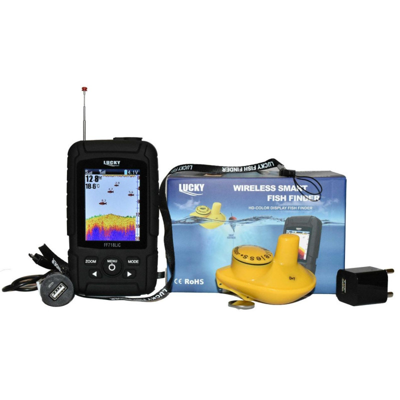 Lucky ff718licw (Lucky ff718lic-w)Компания «Lucky» представляет беспроводно-проводной эхолот с цветным экраном «Lucky FF718LI-W» — беспроводной эхолот Lucky ff718lic-w. Беспроводной эхолот «Lucky ff718licw» оснащен корпусом, который не пропускает влагу, благодаря чему, эхолот можно использовать во время дождя или в непосредственном контакте с водой. В данном беспроводном эхолоте увеличен срок эксплуатации без подзарядки, потому как в него встроен более емкостный аккумулятор. Подзаряжать беспроводной эхолот «Lucky ff718li cw» можно с помощью: USB кабеля, прикуривателя автомобиля и розетки 220 В. От предшествующих моделей беспроводной эхолот «Lucky ff718lic-w» отличается наличием дисплея с цветной матрицей, размер которого увеличен. За счет чего данный беспроводной эхолот передает более качественную и детальную картинку рельефа дна. Также стало возможным использовать беспроводной эхолот «Lucky ff718licw» при насыщенном солнечном свете. Произошли также модификации с разрешением экрана и процессором. За счет более высокого разрешения дисплея, появилась возможность отображать большее количество событий. Более мощный процессор беспроводного эхолота «Lucky ff718licw» обеспечивает ускоренную обработку радиосигнала от беспроводного трансдьюсера. Технические характеристики эхолота Lucky ff718licw:— русскоязычное меню;— дисплей с высококонтрастной матрицей;— размер дисплея 2.8 дюйма;— разрешения дисплея 240*320;— использование беспроводного трансдьюсера на расстоянии более 180 м;— водонепроницаемый корпус;— наличие датчика температуры;— наличие функции прорисовывания рельефа дна;— возможность использования беспроводного трансдьюсера на глубине от 0.6 до 35 м;-использование луча беспроводного датчика под углом 90 градусов;— питание эхолота за счет встроенного литий-ионного аккумулятора, мощностью 3.7 В;— питание беспроводного датчика за счет батареи CR2032; — наличие автоматической функции отключения беспроводного датчика за пределами воды;— способность регулировать уровень чувствительности;— способность регулировать единицу измерения (Цельсий, метр);— способность регулировать диапазон глубины;— индикация на дисплее размера рыбы (большая, средняя, мелкая);— воспроизведение звукового сигнала при разряде батареи;— наличие регулировки яркости экрана;— звуковое оповещение о мелководье.