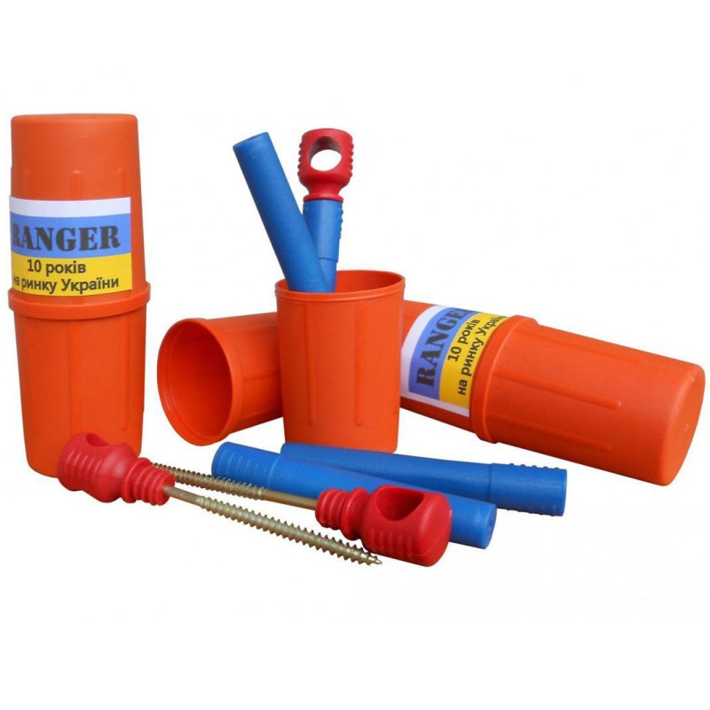 Комплект из 4 ввертышей имеет длину рабочей части 100 мм и позволяет закрепить палатку на любом льду. При транспортировки рабочая часть закрывается специальным чехлом, который при работе становиться удобным воротком. Ввертыши могут храниться в одном чехле с палаткой и не требуют дополнительных инструментов. Пластмассовые детали не «»обжигают»» руки на морозе. Резьбовая часть выполнена из высококачественной стали, которая не ломается на морозе.