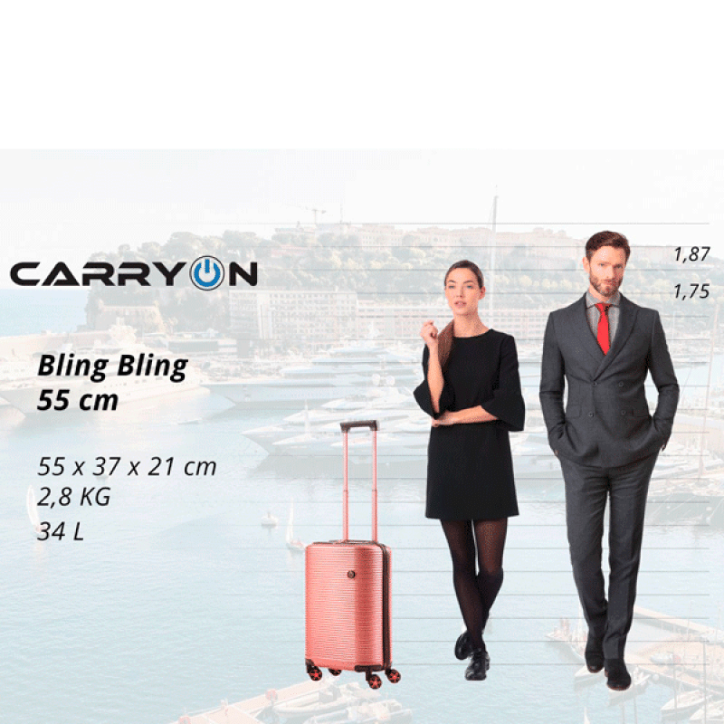 Коллекция Bling Bling бренда CarryOn объединяет в себе лучшие материалы с модным дизайном. Глянцевая поверхность чемодана восхищает своим блеском и красотой. Корпус чемодана выполнен из высокопрочного, комбинированного материала - поликарбоната (PС) и ABS-пластика.