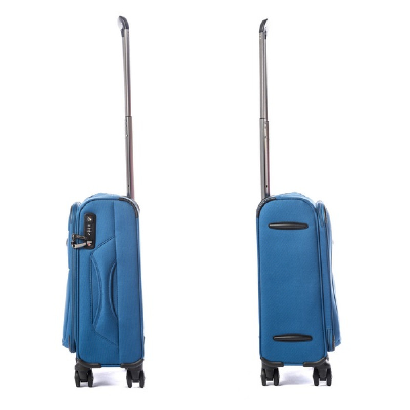 - SOFT SHELL POLYESTER 600D - ткань из полиэстера с толщиной нити 600D, имеющая гладкую поверхность с отблеском, и с внутреннее полиуретановое покрытие, защищающее содержимое чемодана от намокания во время дождя средней интенсивности. Также ткань обладает хорошей износостойкостью, и не разрушается под действием ультрафиолетового излучения.