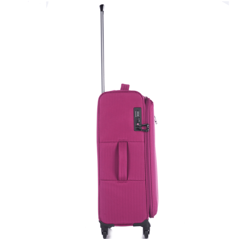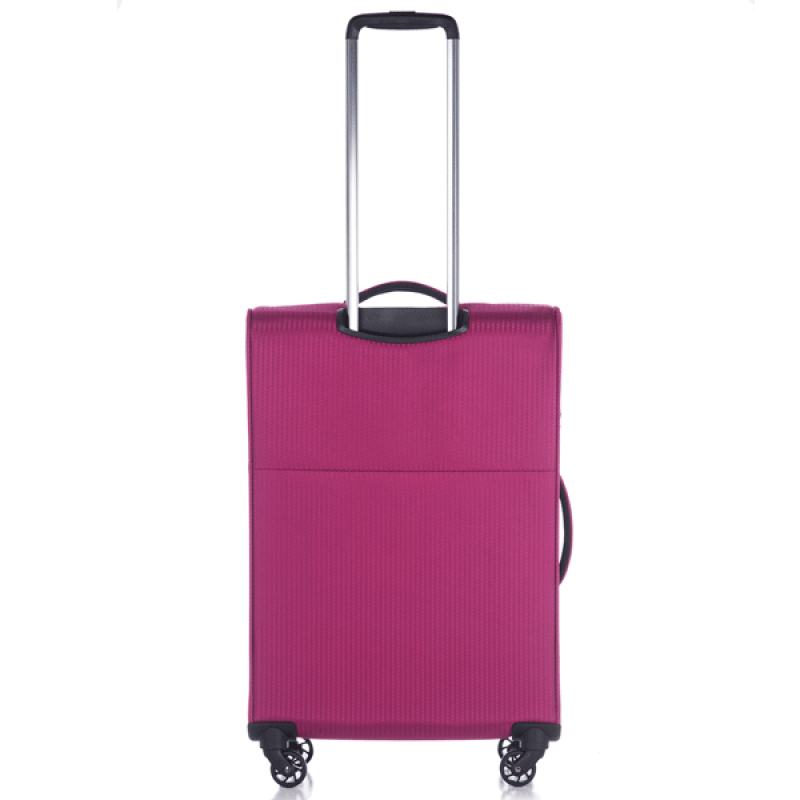 - SOFT SHELL POLYESTER 500D - ткань из полиэстера с толщиной нити 500D, имеющая объемный крупный узор, создающий внешнюю игру света, и с внутреннее полиуретановое покрытие, защищающее содержимое чемодана от намокания во время дождя средней интенсивности. Также ткань обладает хорошей износостойкостью, и не разрушается под действием ультрафиолетового излучения.