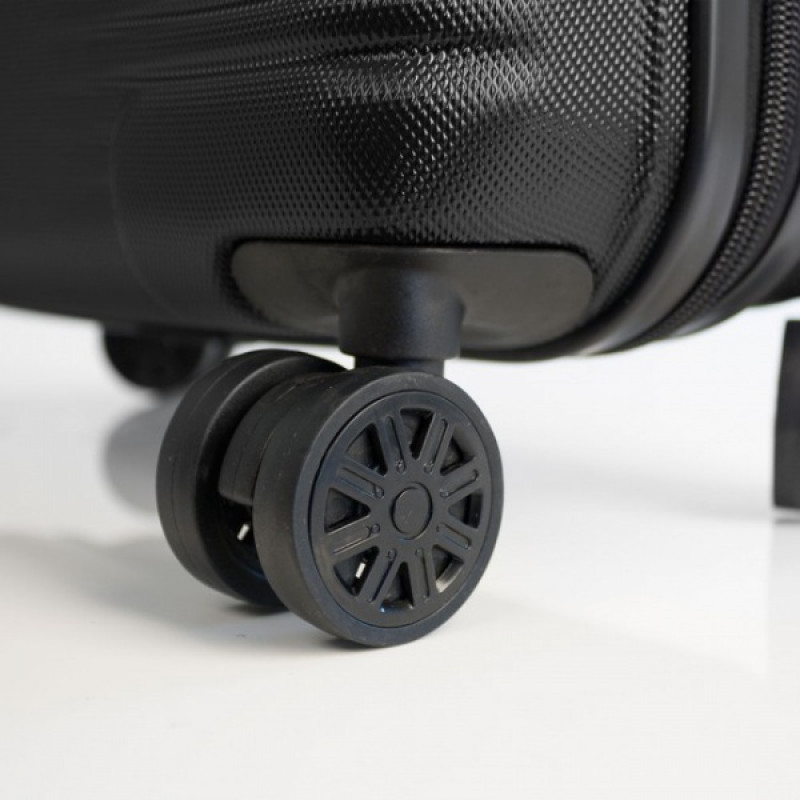 Чемодан оснащен четырьмя полноповоротными, спаренными колесами с возможностью независимого разворота каждого колеса на 360 °. Системой предусмотрено равномерное перераспределения нагрузки на каждое колесо, что в свою очередь способствует плавному качению и маневренности чемодана, прилагая при этом минимум усилий. Колеса изготовлены из высокотемпературного термопластичного полиуретана (TPU). Материал обладает прочностью сравнимой с пластиком, гибкостью силикона, а так же имеет повышенную устойчивость к перепадам температур. Отличительной особенностью колес из TPU материала является снижение шума до минимума при качении чемодана по неровной поверхности. Благодаря устойчивости к истиранию материал колес отличается длительным сроком эксплуатации.