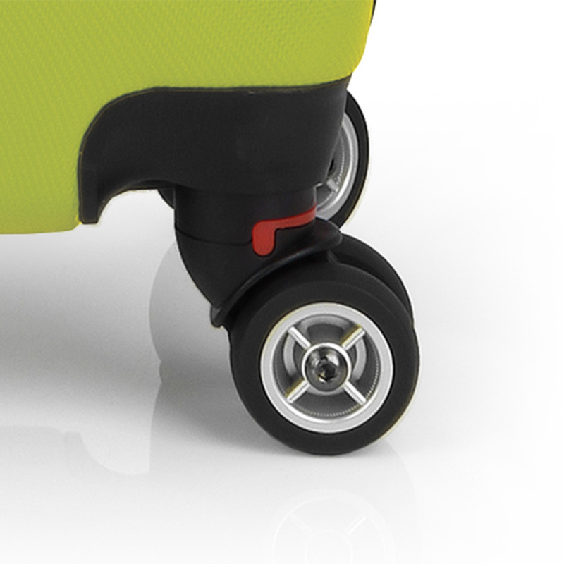 Чемодан оснащен четырьмя полноповоротными, спаренными колесами с возможностью независимого разворота каждого колеса на 360 °. Системой предусмотрено равномерное перераспределения нагрузки на каждое колесо, что в свою очередь способствует плавному качению и маневренности чемодана, прилагая при этом минимум усилий.