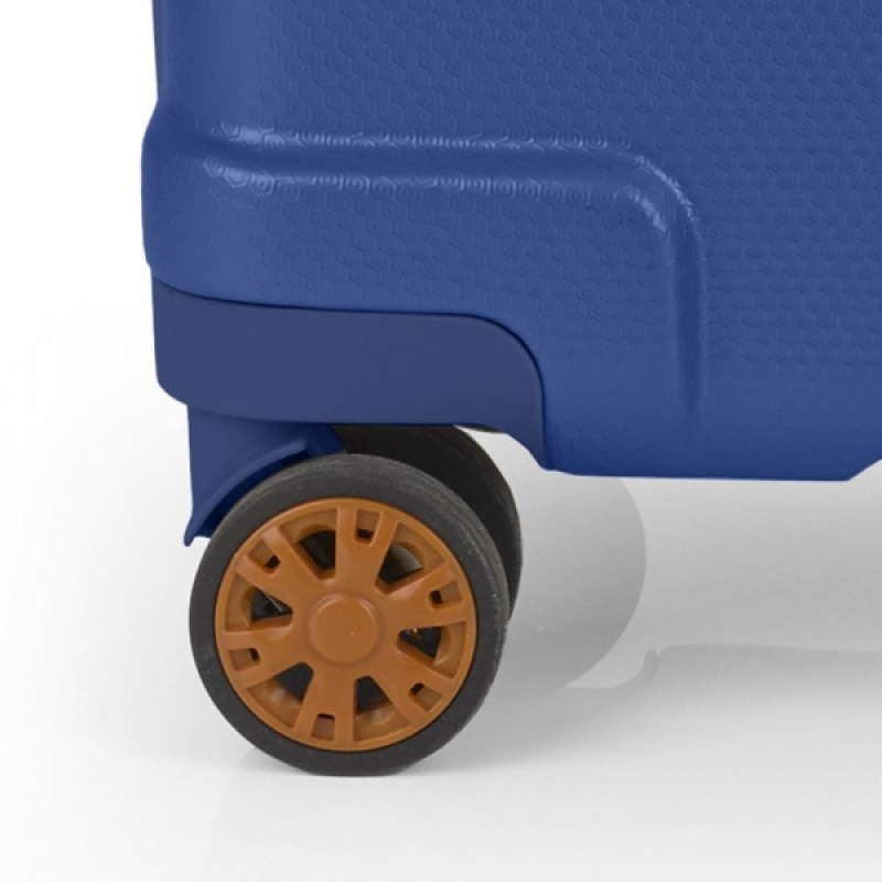 Чемодан оснащен четырьмя полноповоротными, спаренными колесами с возможностью независимого разворота каждого колеса на 360°. Системой предусмотрено равномерное перераспределения нагрузки на каждое колесо, что в свою очередь способствует плавному качению и маневренности чемодана, прилагая при этом минимум усилий. Колеса изготовлены из высокотемпературного термопластичного полиуретана (TPU). Материал обладает прочностью сравнимой с пластиком, гибкостью силикона, а так же имеет повышенную устойчивость к перепадам температур. Отличительной особенностью колес из TPU материала является снижение шума до минимума при качении чемодана по неровной поверхности. Благодаря устойчивости к истиранию материал колес отличается длительным сроком эксплуатации.