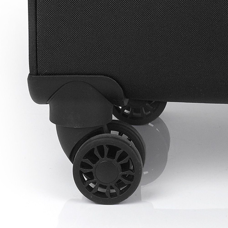 Чемодан оснащен четырьмя полноповоротными, спаренными колесами с возможностью независимого разворота каждого колеса на 360°. Системой предусмотрено равномерное перераспределения нагрузки на каждое колесо, что в свою очередь способствует плавному качению и маневренности чемодана, прилагая при этом минимум усилий. Колеса изготовлены из высокотемпературного термопластичного полиуретана (TPU). Материал обладает прочностью сравнимой с пластиком, гибкостью силикона, а так же имеет повышенную устойчивость к перепадам температур. Отличительной особенностью колес из TPU материала является снижение шума до минимума при качении чемодана по неровной поверхности. Благодаря устойчивости к истиранию материал колес отличается длительным сроком эксплуатации.