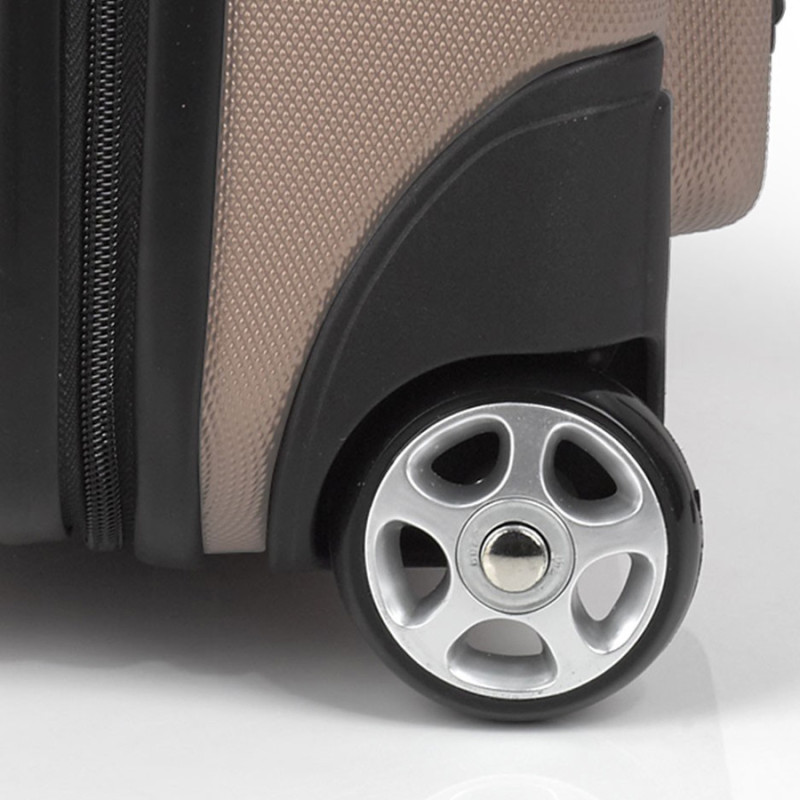 Чемодан оснащен парой надежных колес которые изготовлены из высокотемпературного термопластичного полиуретана (TPU). Материал обладает прочностью сравнимой с пластиком, гибкостью силикона, а так же имеет повышенную устойчивость к перепадам температур. Отличительной особенностью колес из TPU материала является снижение шума до минимума при качении чемодана по неровной поверхности. Благодаря устойчивости к истиранию материал колес отличается длительным сроком эксплуатации.