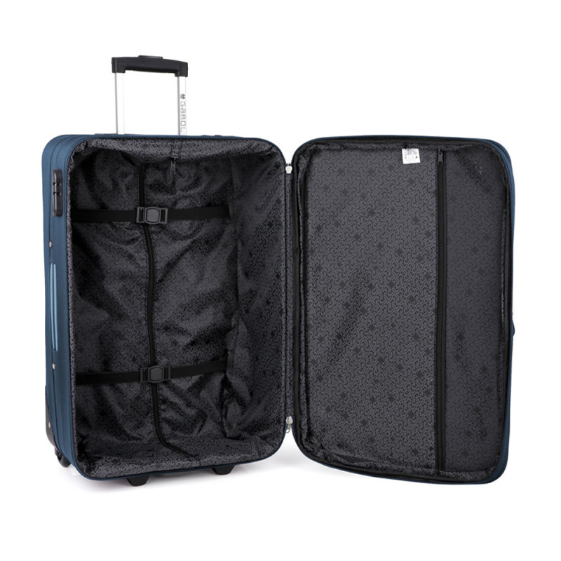 Коллекция чемоданов Gabol Reims имеет оптимальное соотношение качества, функциональности и стоимости. Чемоданы оснащены надежной парой роликовых колес из TPU материала, выдвижной фиксируемой телескопической ручкой и встроенным кодовым замком. Каркас дна легкий и прочный благодаря сотовой структуре строения. На фасадной части размещен большой вместительный кармана на молнии. Внутренний объем разделен перегородкой на два отделения и имеет ремни для фиксации вещей внутри. Чемодан легкий, маневренный и удобный для транспортировки.