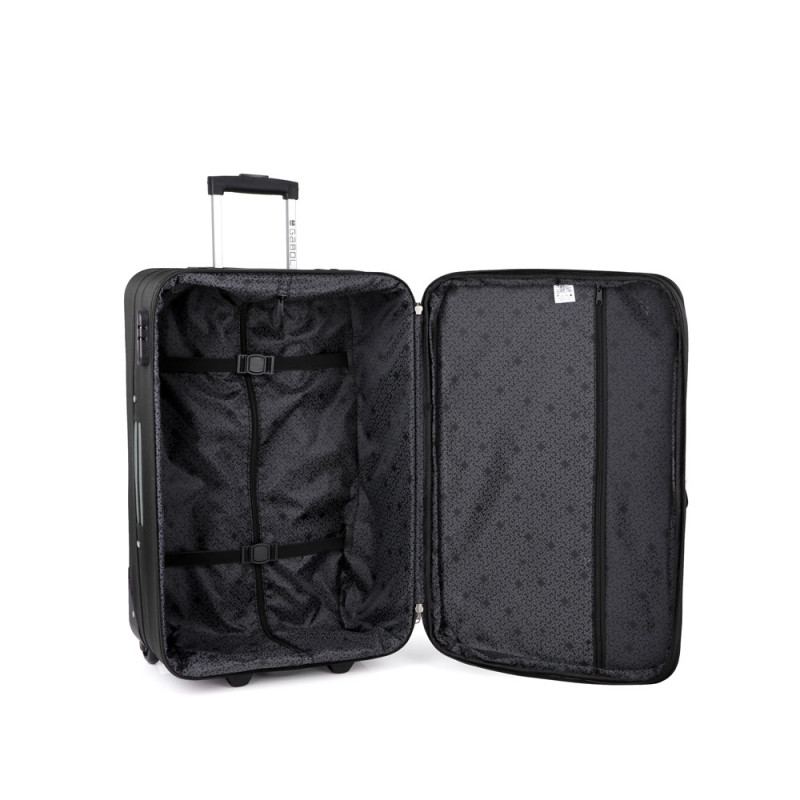 Коллекция чемоданов Gabol Reims имеет оптимальное соотношение качества, функциональности и стоимости. Чемоданы оснащены надежной парой роликовых колес из TPU материала, выдвижной фиксируемой телескопической ручкой и встроенным кодовым замком. Каркас дна легкий и прочный благодаря сотовой структуре строения. На фасадной части размещен большой вместительный кармана на молнии. Внутренний объем разделен перегородкой на два отделения и имеет ремни для фиксации вещей внутри. Чемодан легкий, маневренный и удобный для транспортировки.