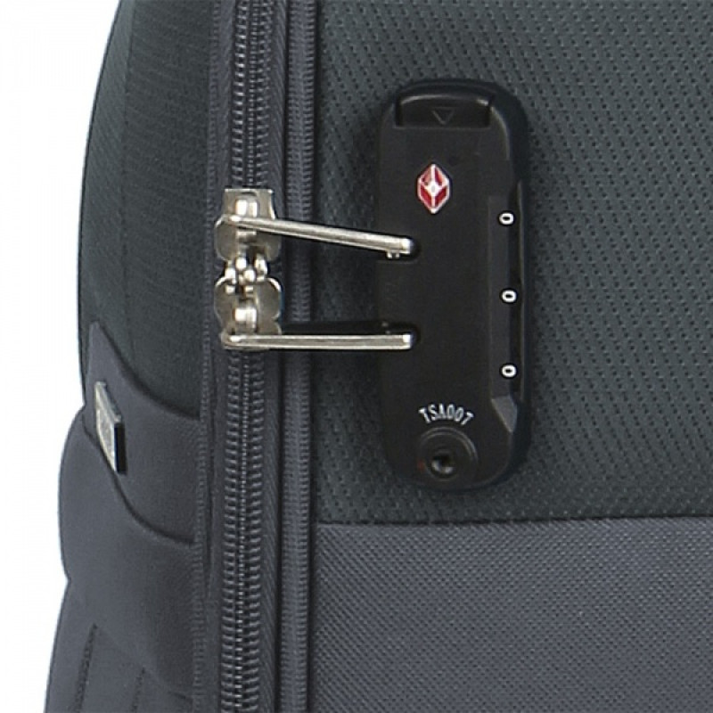 Чемодан оборудован фирменным кодовым замком с функцией таможенного досмотра TSA (Transportation Security Administration - Администрация по безопасности на транспорте). Таможенные службы совместно с Американской Ассоциацией по безопасности на транспорте (Transportation Security Administration или, сокращенно, TSA) получили абсолютное право, в целях безопасности, досматривать любой чемодан на колесах или сумку, показавшуюся им подозрительной. Агенты по безопасности на транспорте снабжены специальными TSA ключами, за которые они несут персональную ответственность. Благодаря наличию в замке функции TSA после досмотра ваши замки останутся целыми и невредимыми в отличии от багажа без функции TSA.