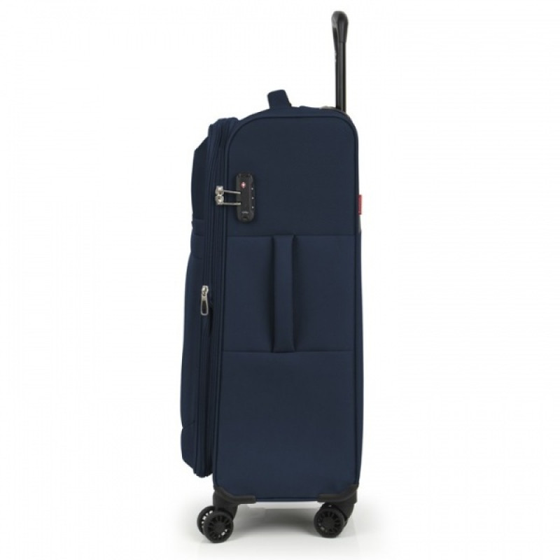 Чемодан Gabol серии Roma оснащен кодовым замком системы TSA для повышения безопасности. На фасадной части размещен вместительный карман на молнии. Внутренний объем имеет ремни для фиксации вещей внутри. Предусмотрена возможность увеличить полезный объем чемодана до 20%, благодаря наличию клапана, расстегнув специальную молнию по периферии чемодана. Чемодан легкий, маневренный и удобный для транспортировки.