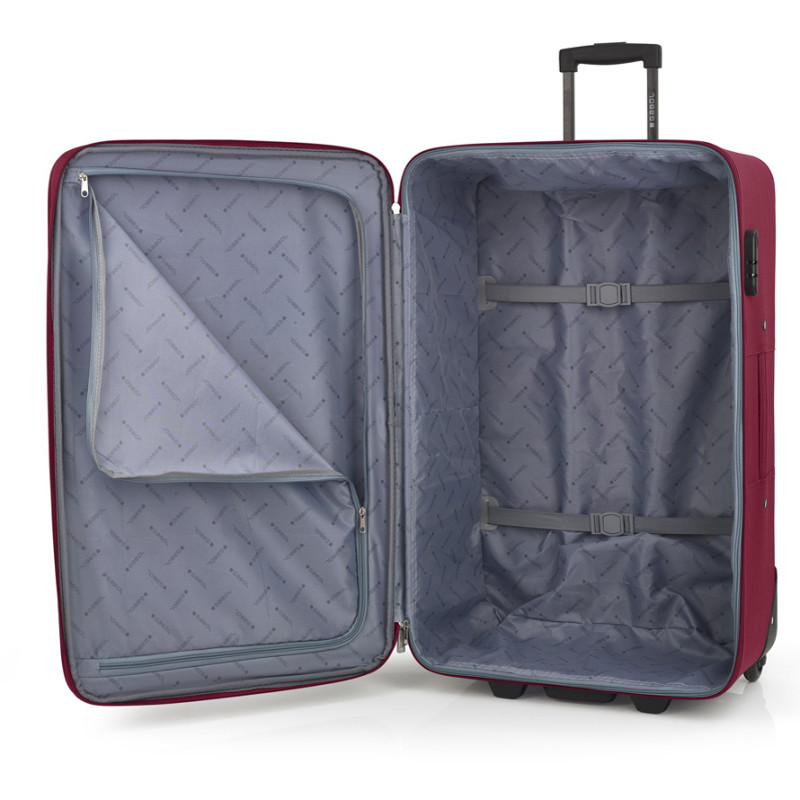 - Чемодан разделен перегородкой на молнии на два основных отделения.