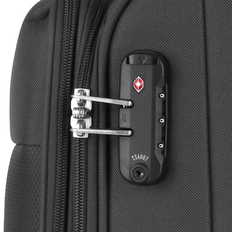 Чемодан оборудован фирменным кодовым замком с функцией таможенного досмотра TSA (Transportation Security Administration - Администрация по безопасности на транспорте). Таможенные службы совместно с Американской Ассоциацией по безопасности на транспорте (Transportation Security Administration или, сокращенно, TSA) получили абсолютное право, в целях безопасности, досматривать любой чемодан на колесах или сумку, показавшуюся им подозрительной. Агенты по безопасности на транспорте снабжены специальными TSA ключами, за которые они несут персональную ответственность. Благодаря наличию в замке функции TSA после досмотра ваши замки останутся целыми и невредимыми в отличии от багажа без функции TSA.