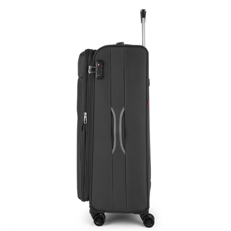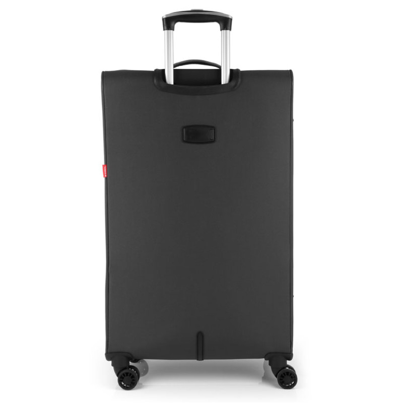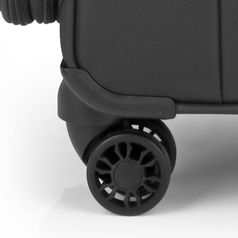 Чемодан оснащен четырьмя спаренными роликовыми колесами из высокотемпературного термопластичного полиуретана (TPU). Материал обладает прочностью сравнимой с пластиком, гибкостью силикона, а так же имеет повышенную устойчивость к перепадам температур. Отличительной особенностью колес из TPU материала является снижение шума до минимума при качении чемодана по неровной поверхности. Благодаря устойчивости к истиранию материал колес отличается длительным сроком эксплуатации.