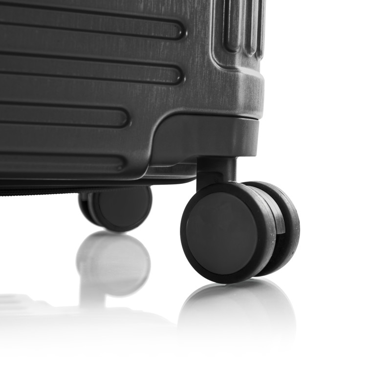 Чемодан оснащен четырьмя, полноповоротными колесами с возможностью независимого разворота каждого колеса на 360 °. Системой предусмотрено равномерное перераспределения нагрузки на каждое колесо, что в свою очередь способствует плавному качению и маневренности чемодана, прилагая при этом минимум усилий. Также система позволяет быструю смена колес без, задействования сервисного центра.