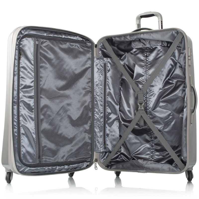- Компресійний ремінь із пряжкою для фіксації багажу всередині валізи.