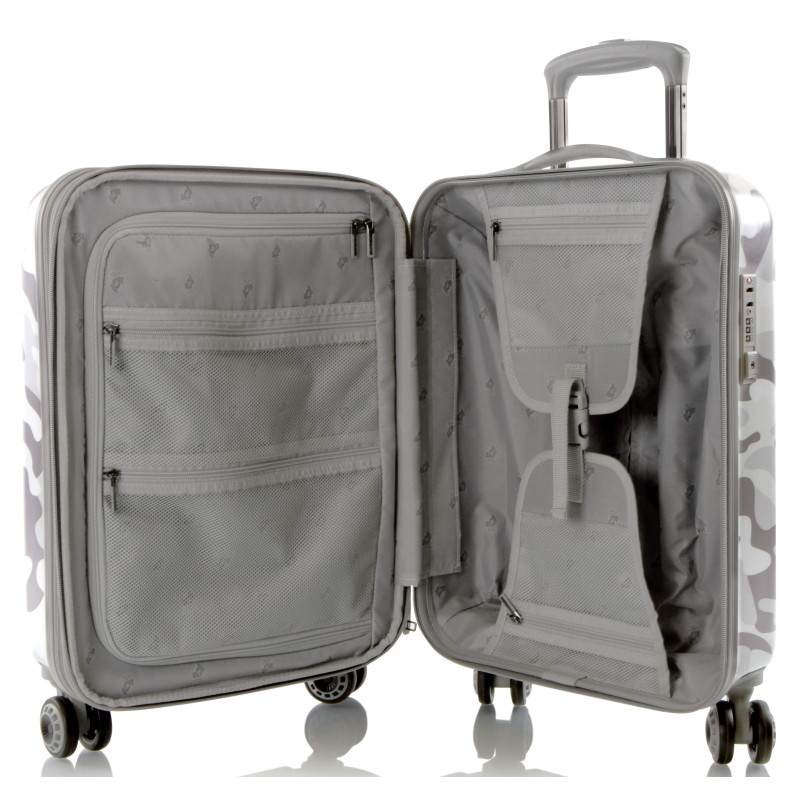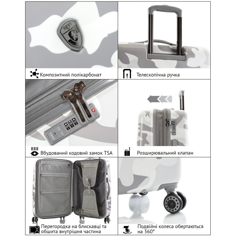 Валізи Heys White Camo виконані з дуже легкого, еластичного і в той же час міцного матеріалу. Завдяки своїм властивостям, полікарбонат композитний (Polycarbonate Composite) стійкий до деформацій (після деформації приймає колишню форму), не розтріскується на морозі, також використовується при виготовленні куленепробивного скла.