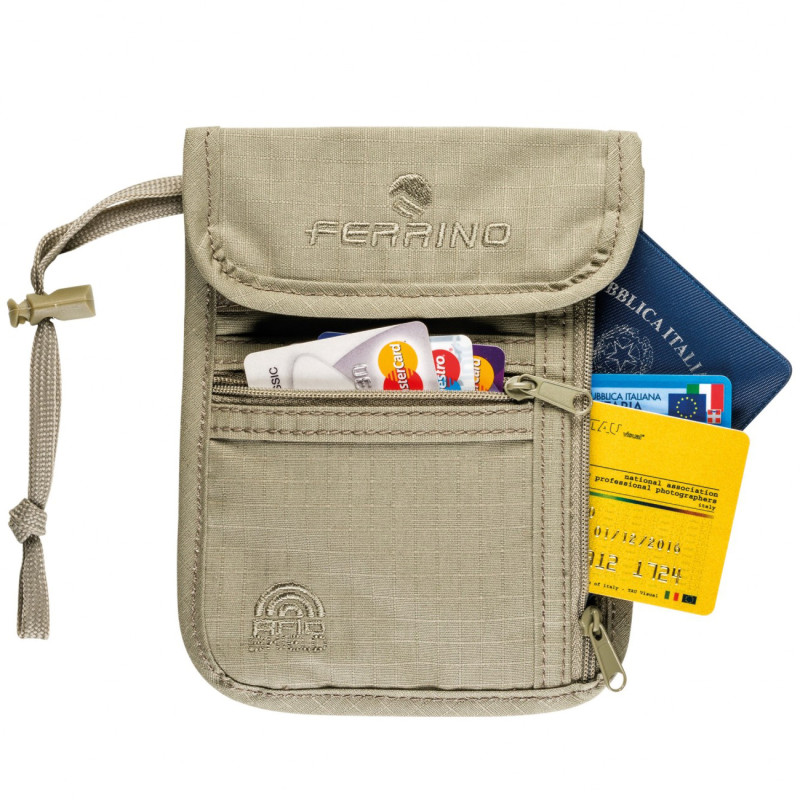 Ferrino Anouk RFID Neutral - специальная потайная сумка для документов, которая позволяет в походах и поездках хранить паспорта, банковские карты, ключи, смартфон и деньги при себе, а также защитить банковские карты или электронное устройство от кражи денег и информации с помощью RFID-защиты. Сумка очень тонкая, ее без проблем можно носить под одеждой. Поскольку сумка напрямую может контактировать с кожей, то для ее производства выбран натуральный экологический материал - хлопок, а обратная сторона сделана сетчатой. Материал достаточно прочный, имеет структуру переплетения ripstop. Сумка имеет внешнюю гидрофобную пропитку, что повышает защищенность вещей от промокания. Нашейный шнурок плоский и полый, благодаря чему не натирает кожу. Его длина регулируется фиксатором. Сумка имеет четыре кармана, в которых можно разместить паспорт, смартфон и другие важные мелочи.