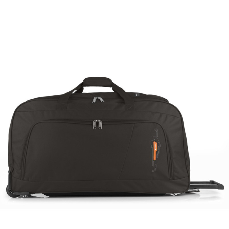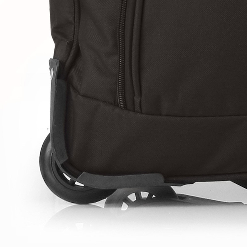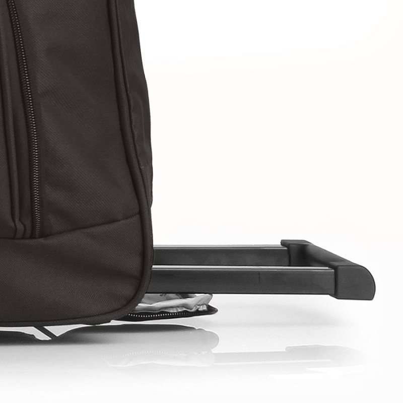 Сумка оснащена парой надежных роликовых колес. Колеса изготовлены из высокотемпературного термопластичного полиуретана (TPU). Материал обладает прочностью сравнимой с пластиком, гибкостью силикона, а так же имеет повышенную устойчивость к перепадам температур. Отличительной особенностью колес из TPU материала является снижение шума до минимума при качении сумки по неровной поверхности. Благодаря устойчивости к истиранию материал колес отличается длительным сроком эксплуатации.