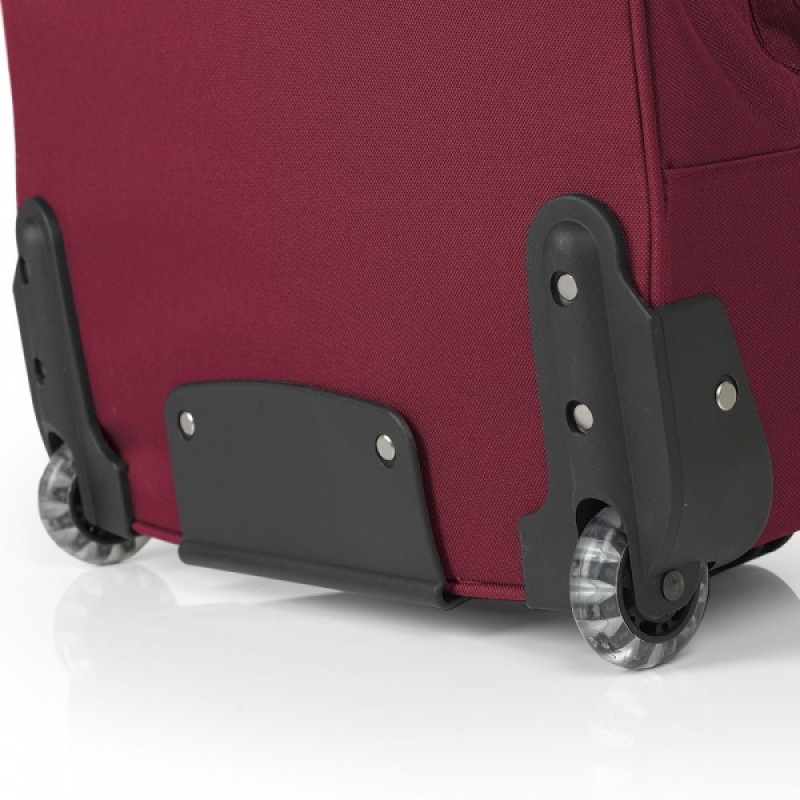 Сумка оснащена парой надежных роликовых колес. Колеса изготовлены из высокотемпературного термопластичного полиуретана (TPU). Материал обладает прочностью сравнимой с пластиком, гибкостью силикона, а так же имеет повышенную устойчивость к перепадам температур. Отличительной особенностью колес из TPU материала является снижение шума до минимума при качении чемодана по неровной поверхности. Благодаря устойчивости к истиранию материал колес отличается длительным сроком эксплуатации.