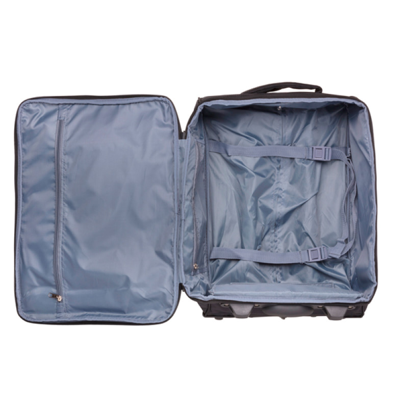 Эргономичная система выдвижной телескопической ручки с кнопочным фиксатором позволяет отрегулировать высоту выдвижной ручки для дополнительного удобства и комфорта пользователя. Внутренний объем разделен перегородкой на два отделения и имеет ремни для фиксации вещей и дополнительные карманы.