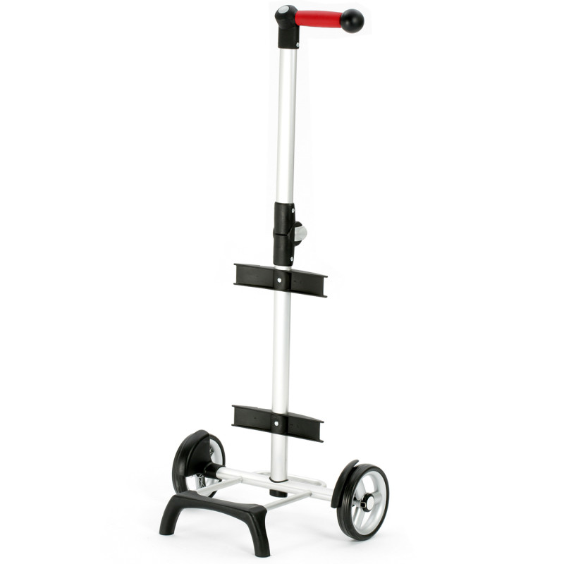 - Тележка оснащена телескопической ручкой, что позволяет вдвое уменьшить высоту конструкции и фиксировать ручку на любую высоту.