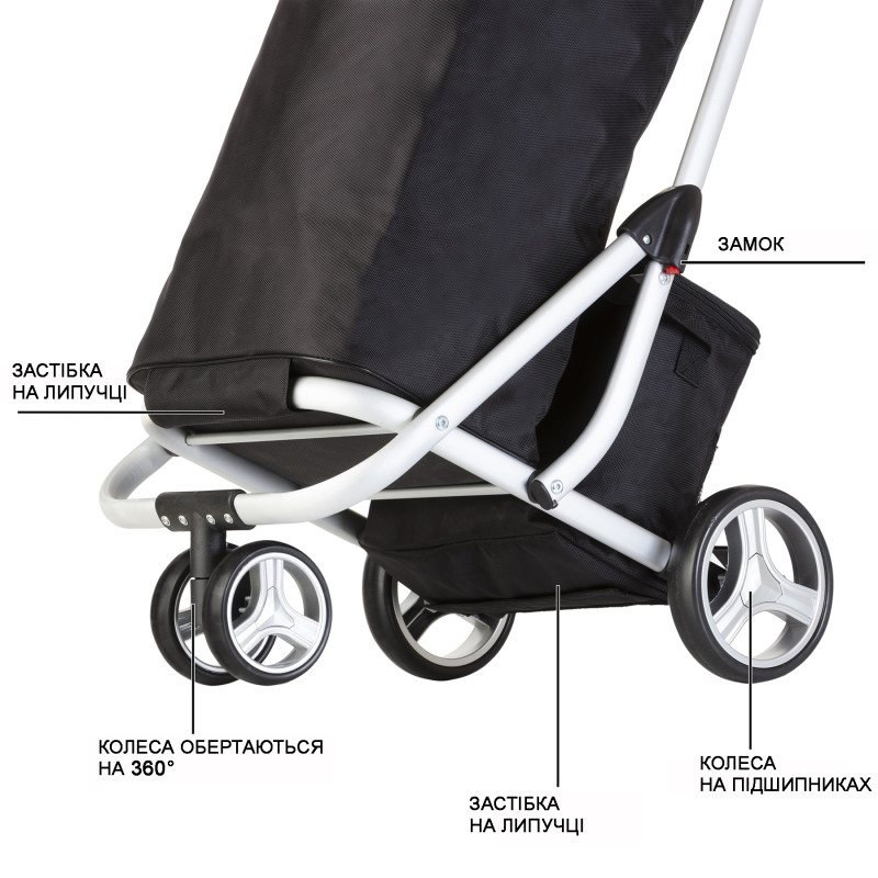 Сумка-тележка 3 Wheels обладает всеми достоинствами тележек торговой марки ShoppingCruiser® - легкостью, прочностью, устойчивостью, компактностью. Четырехколесная система обеспечивает большую устойчивость и маневренность, а также возможность вести тележку с покупками или другим багажом впереди Вас. Конструкцией шасси предусмотрено трехточечную опору колес, благодаря чему сумка-тележка сама по себе устойчива, а так же может служить пользователю дополнительной опорой при ходьбе. Передняя пара колес имеет возможность независимого разворота на 360°, что позволяет легко маневрировать при движении.