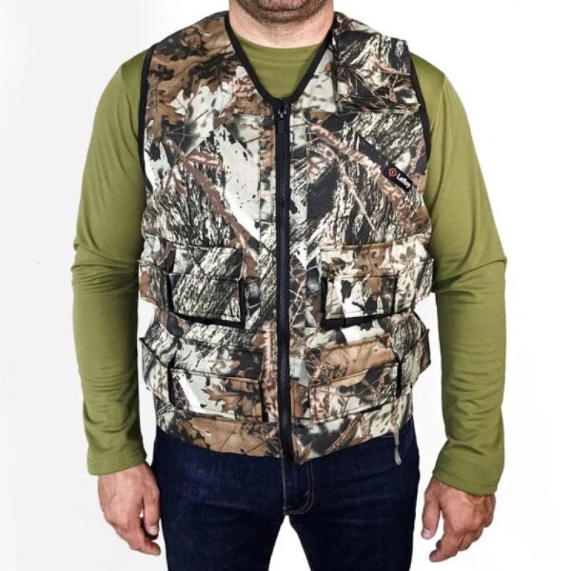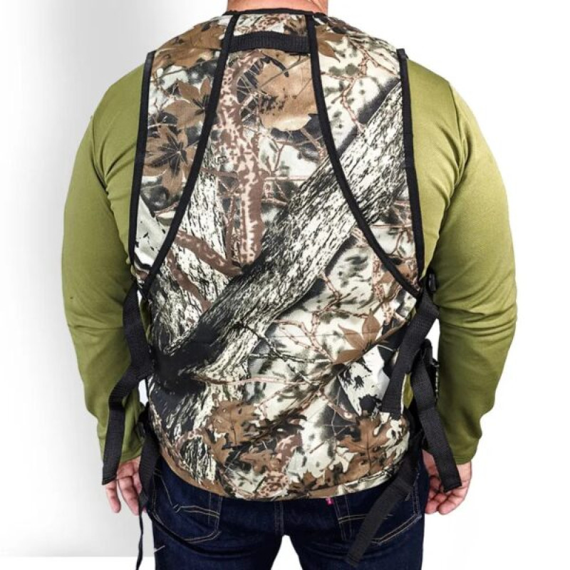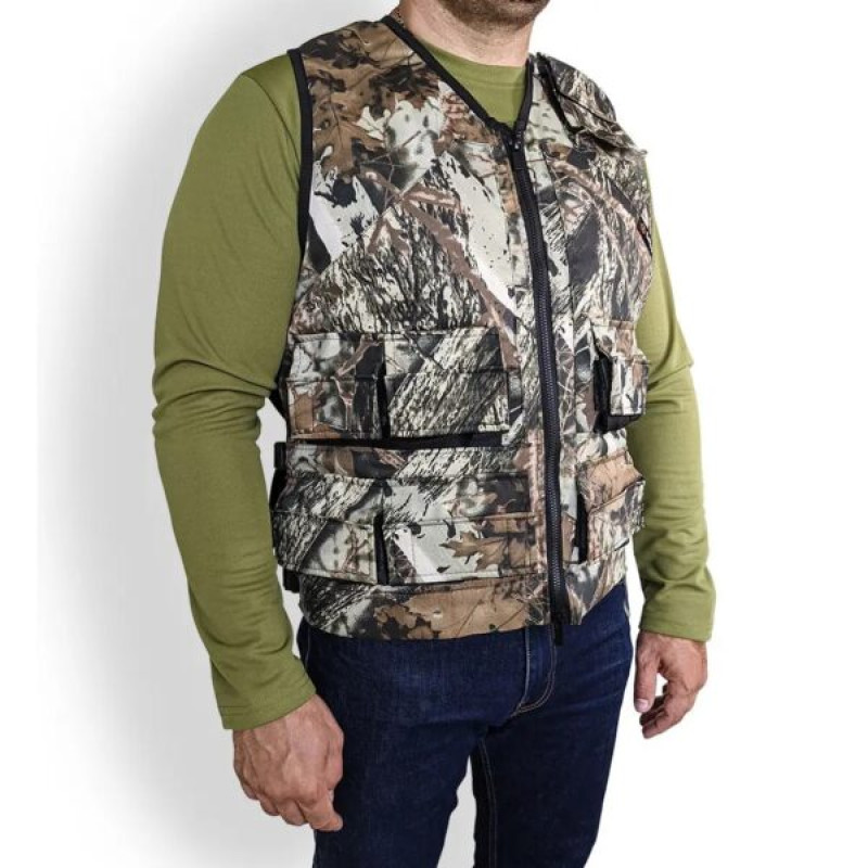 Жилет охотника с патронташем на 36 патронов 12 и 16 калибра. Выполненный из ткани саржевого плетения, защищает от ветра и не шелестит во время движения. Спереди находятся 3 кармана: нагрудный для мелких вещей и два глубоких для рук и разных предметов. Внутри дополнительный карман на молнии 17 на 13,5 см. Размер можно изменять благодаря ремням• Размер универсальный.• Цвет – камуфляж