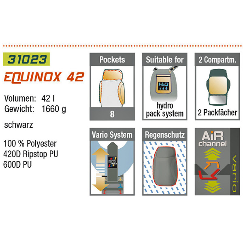 • Системы VARIO system  позволяет оперативно настроить максимально комфортную посадку рюкзака на спине человека с учетом анатомических особенностей человека